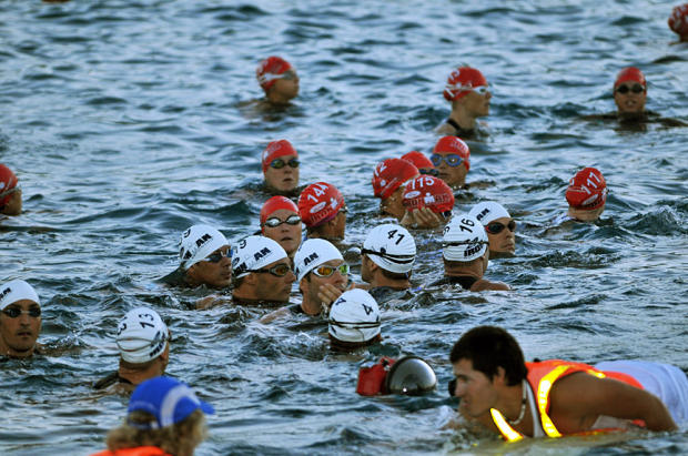The elite swim wave has its own SUP (stand up paddle) entourage
