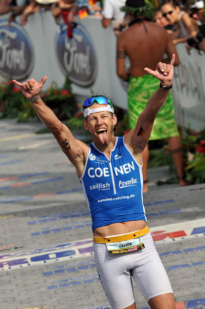 Clemens Coenen of Germany celebrates his 25th place in 8:41:33.