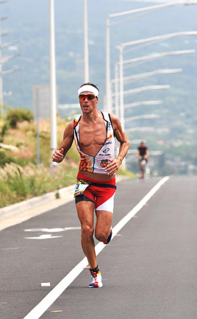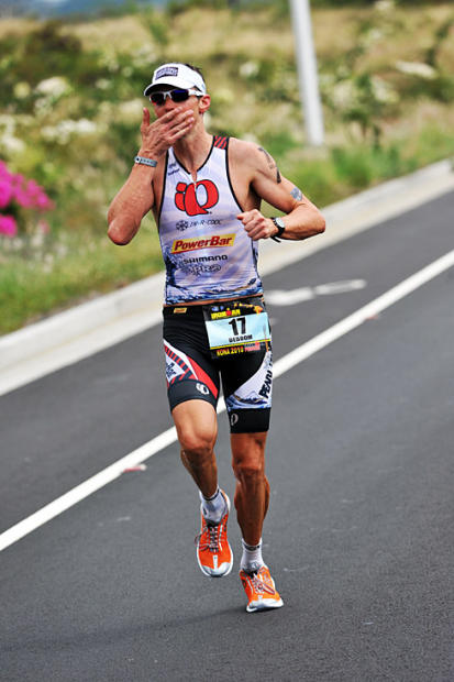 Andreas Raelert copies brother Michael's cooling strategy – wide open race jersey. Raelert's 2:44:25 run was 4th best and left him second to Macca at the line.