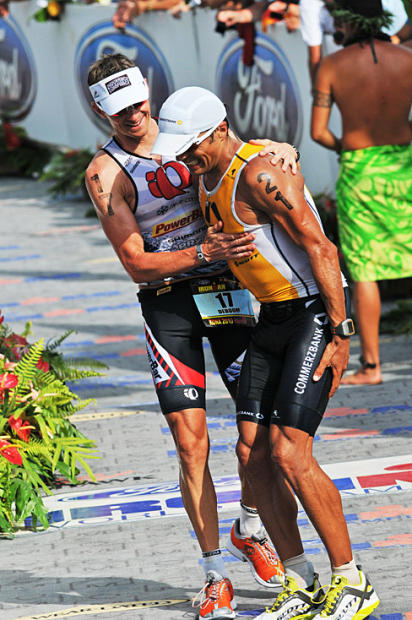 Tim DeBoom helps fellow two-time Ironman Hawaii champion Normann Stadler after they finished in identical 8:46:29 times in 33rd and 34th places.