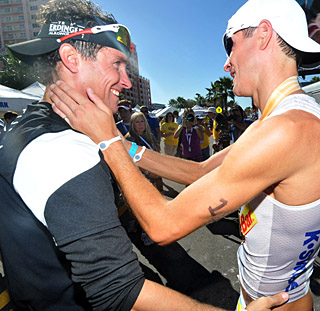 Andreas Raelert and brother Michael Raelert at Ironman Hawaii — Michael gave accurate splits to Chris McCormack while his brother was fighting with Macca for the win. Andreas shook hands with Macca with two and a half miles to go. After losing, Andreas smiled and said it was an honor to be in such a magnificent duel with the Australian.