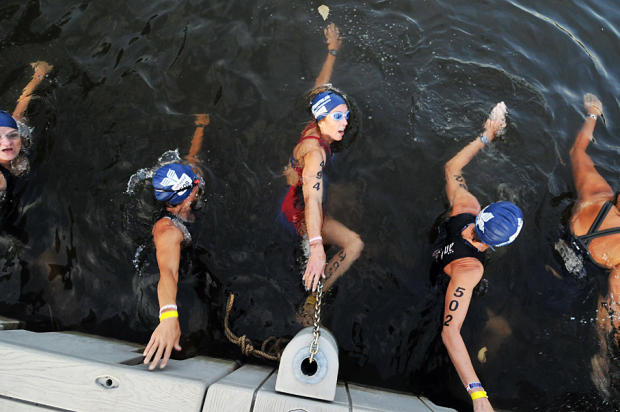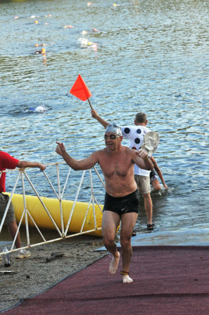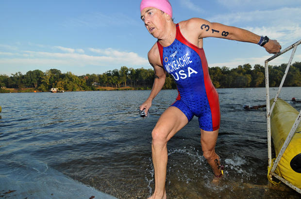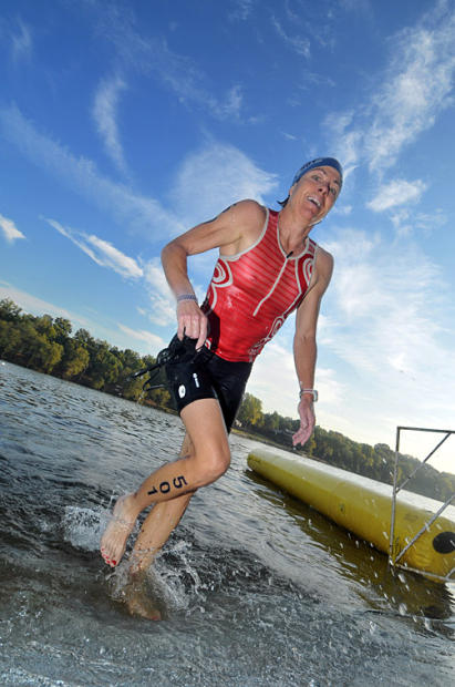 Ida Jonsen, 52, of Broomfield, Colorado exits the swim.