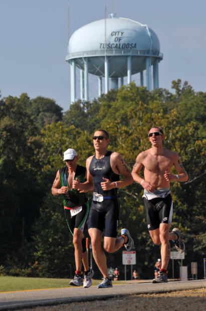 Brett Nichols (775) 27, of Brookline, Massachusetts, Benjamin Trnka, 22, of Collegeville, Minnesota (607), and Eugene O’Donnell, 31, of Madison, Wisconsin (929) run past the Tuscaloosa water tower.