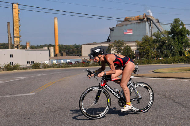 Maura Guthrie, 48, of Dallas Texas, rides past a foundry on the age group bike course.