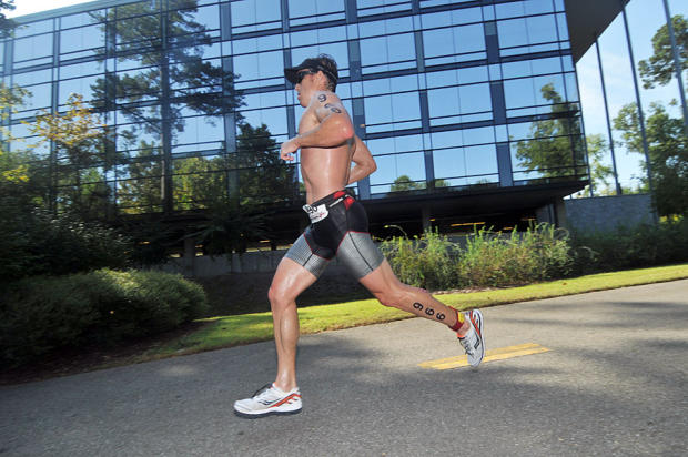 Austin Jackson, 33, of Virginia Beach, Virginia runs past a gleaming concrete and glass office building in the trees on the run course