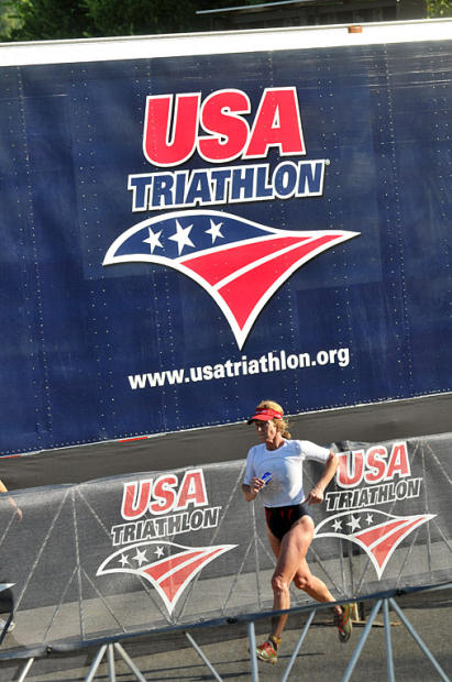 A woman with number obscured runs past USAT signage at the race center at Manderson Landing.