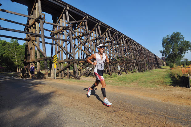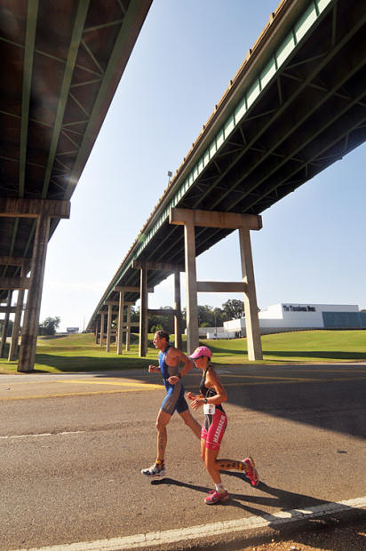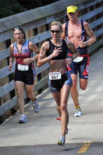 Fred Soltow, 62, of Shepherdstown, West Virginia and Amy Rappaport, 50, of Tewksbury Township, New Jersey, run under a tall highway bridge on the run course. Rappaport finished 6th in 50-54 in 2:30:43. Soltow was 8th in 60-64 in 2:33:45.