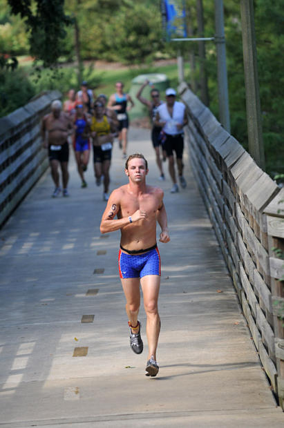 Matthew Maley, 23, of Lantana Florida (number 623) runs away from a pack of competitors over a wooden bridge.