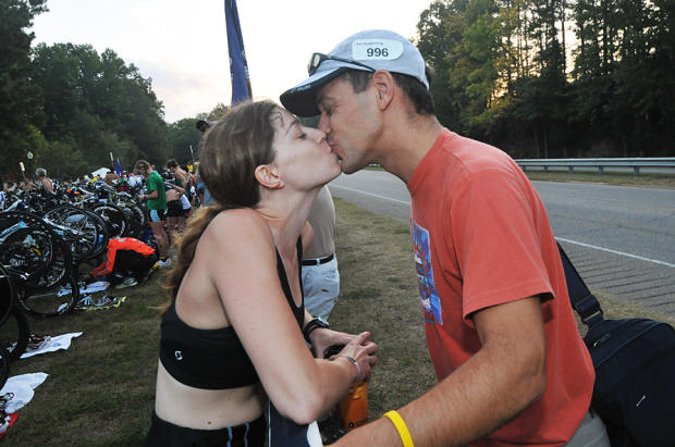 Elizabeth Kuhl, 30 of Cincinnati, Ohio gets a kiss before her race.