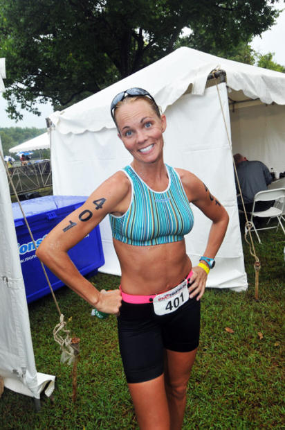 Kimberly Dunker, 27, of Athens Georgia does an elegant stretch before the swim. The stretches must have helped — she finished 2nd in women’s 25-29 in 1:12:40.