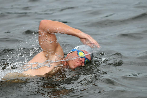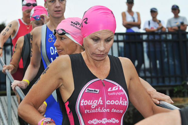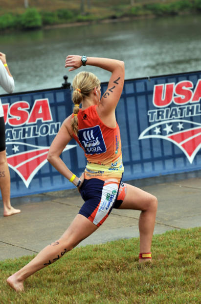 Kimberly Dunker, 27, of Athens Georgia does an elegant stretch before the swim. The stretches must have helped — she finished 2nd in women’s 25-29 in 1:12:40.