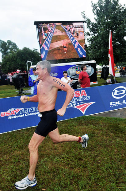 James Smith, 37, of Washington Township, Pennsylvania takes off his swim suit on the way to T1. Smith won men’s 35-39 in 1:05:51.
