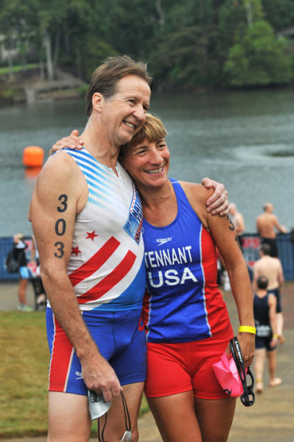Barry Cross, 59, of Denver, Colorado hugs Elizabeth Tennant, 46, of Littleton, Colorado before the start. Tennant won women’s 45-49 in 1:16:50.