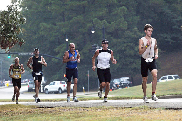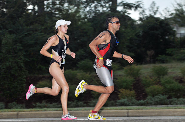 A. Pierre Yurow, 40, of New York City, leads Jennifer Clay, 18, of South Elgin, Illinois starting the run.