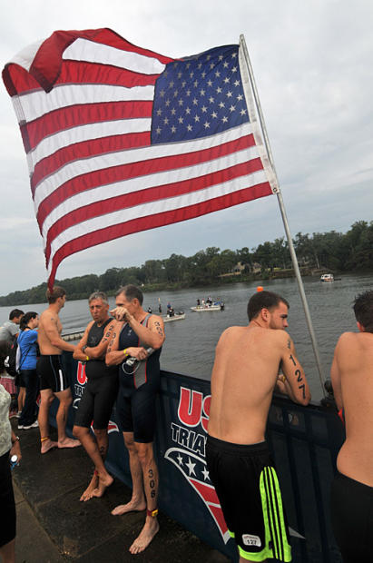 Corbin McDaniel, 24, of Lula, Georgia stands beneath the flag before the start. Triathlon is an American sport and proud of it.