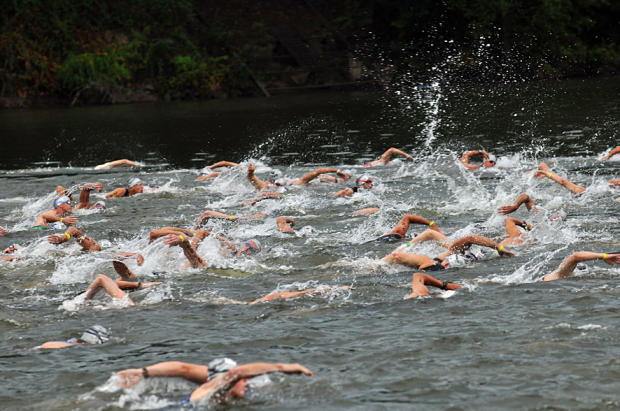 A maelstrom of churning arms and legs mid-swim.