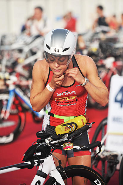 Jodie Swallow refuels on the go during the bike leg on her way to 6th place.