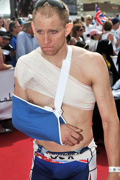 Andrew Starykowicz crashed when an aid station volunteer stepped in front of his bike. He still set race record for the bike but had to withdraw before the run.