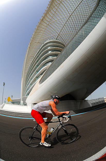 Riding through the surrealistically modern Formula 1 track at Yas Marina.