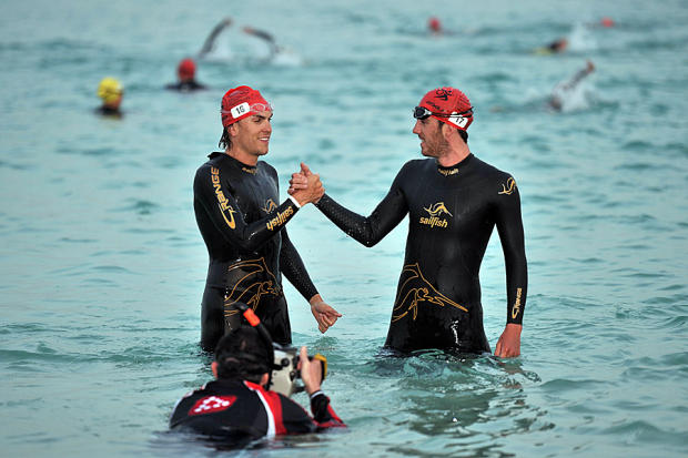 Johann Ackermann and Niclas Bock shake hands before the swim.
