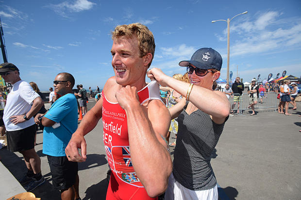 Nikki Butterfield helps husband Tyler Butterfield into his wetsuit.