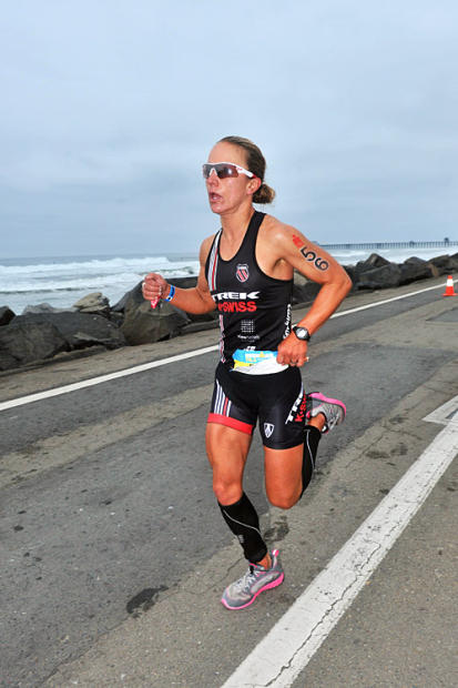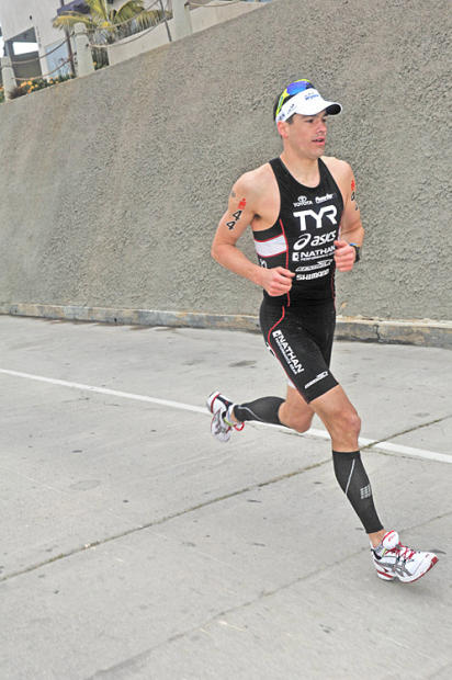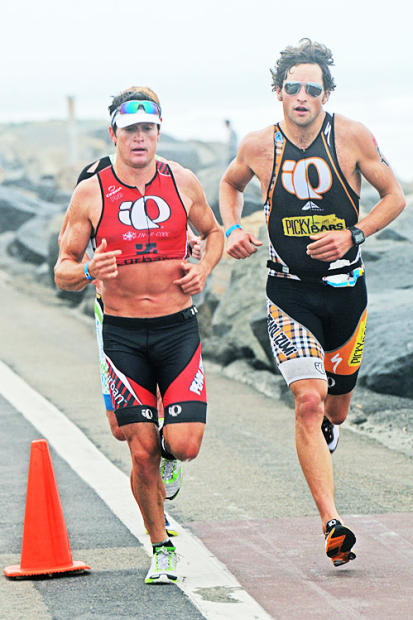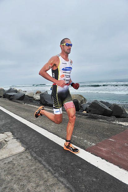 Paul Ambrose runs to 5th place past a local surfer on the Oceanside 70.3 course.