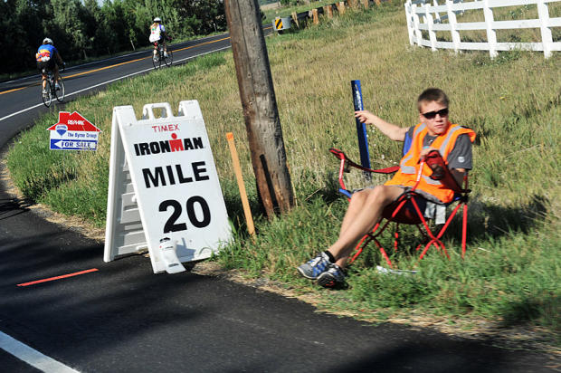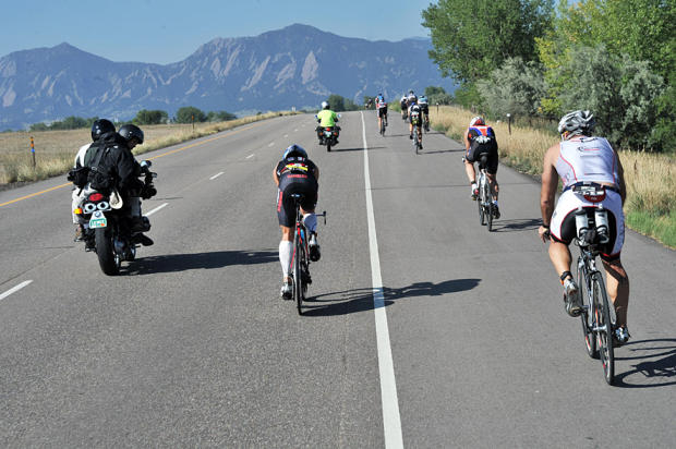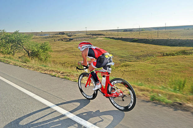 Joe Gambles heads for home past age groupers who were just wrapping up their first lap of the 56-mile bike.