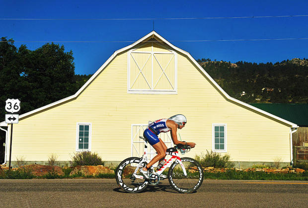 Age grouper rides past the Big W barn at Mile 8 of the two loop, 28-mile bike course.
