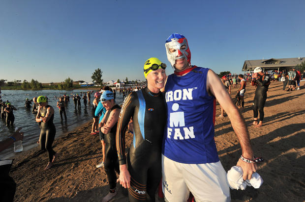 Leanda Cave gets a hug from the very large Ironman Fan mascot before the start.