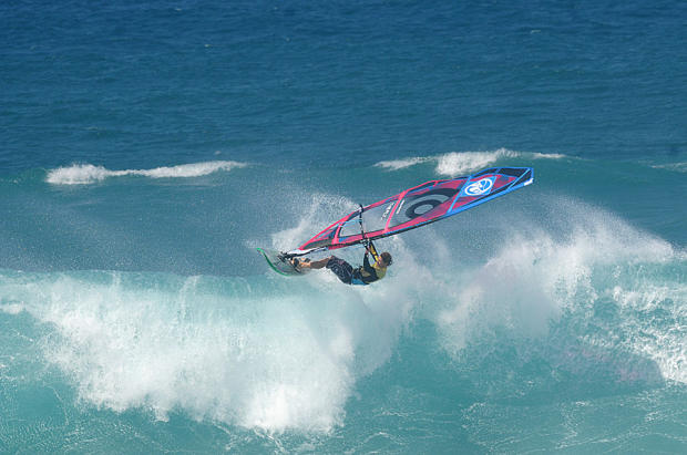 Just 35 miles away from the XTERRA race site at Kapalua, wind surfers compete on 10 foot waves at an international contest at Hookipa.