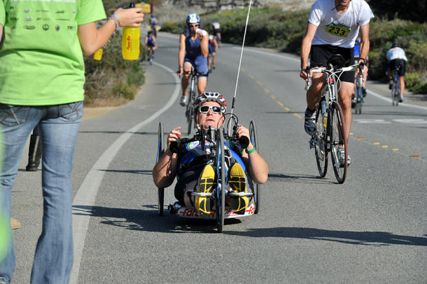 A physically challenged competitor powers his handcycle.