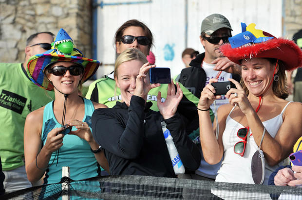 Tri fans with fashionable hats and digital cams to catch the action.