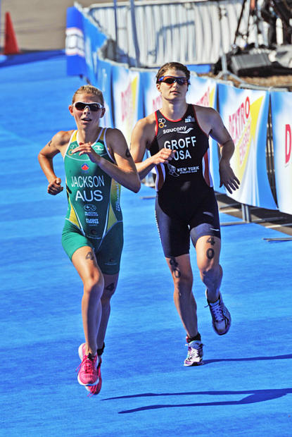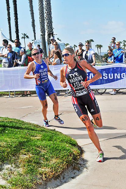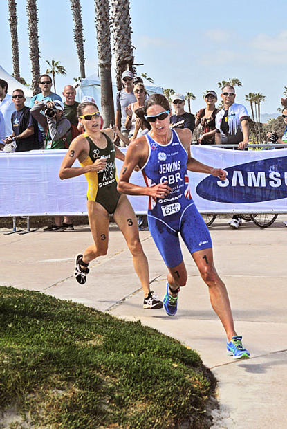 Erin Densham starts the run on Helen Jenkins' shoulder. By the end, the Aussie star was 1:05 back of the Great Brit.