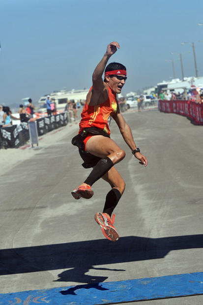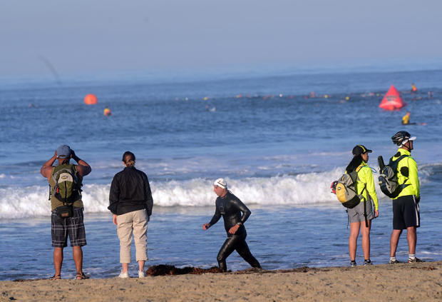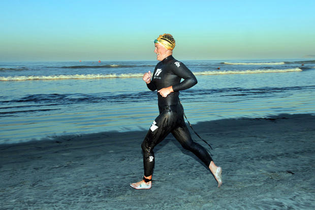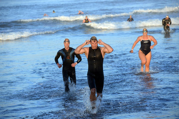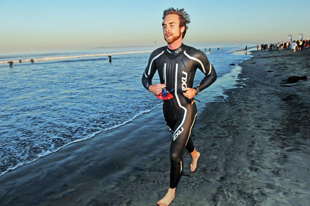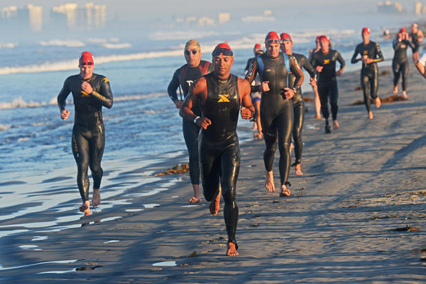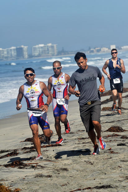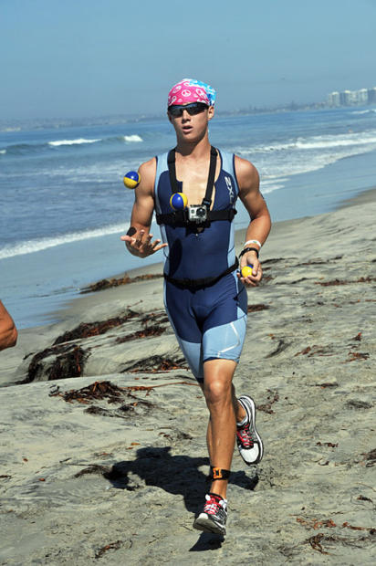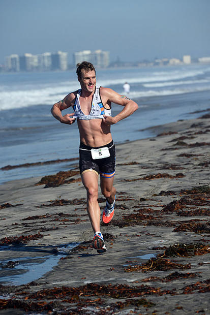 Crowds of wet-suited competitors sprint up the beach toward Lap 2.