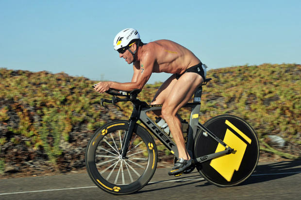 Old school Speedo-only race gear displays Lance Armstrong's impressive physical power.