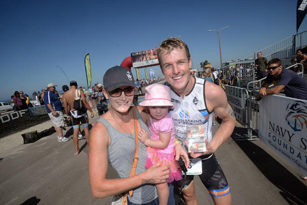 Cheerful Tyler Butterfield adjusts his jersey and number as he passes wife Nikki and daughter Savana at the start of the sandy seaside run.