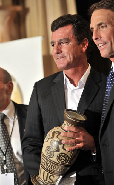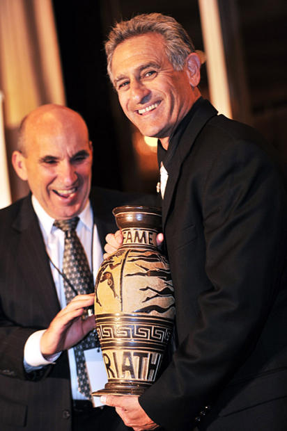Bog Babbitt holds tight to his Hall of Fame vase presented by USA Triathlon's Chuck Graziano.