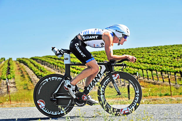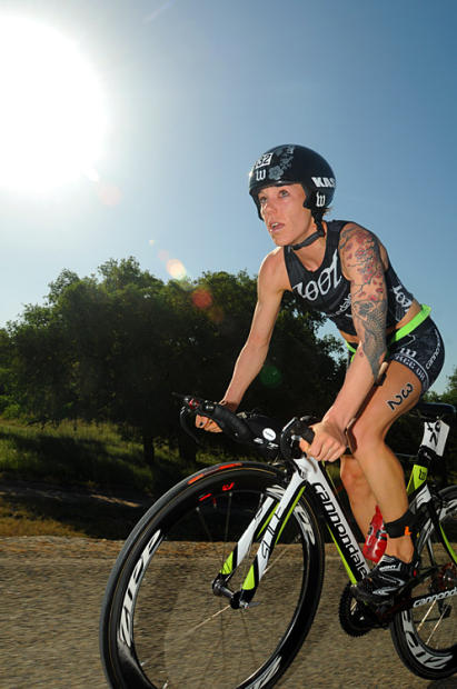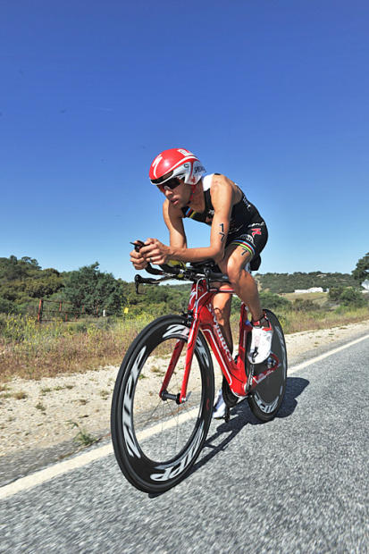 Real life bike passing a model of the incomparable Paula Newby-Fraser in a perfect tuck.
