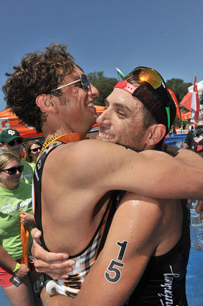 Jesse Thomas hugs his great good friend Matt Lieto at the finish.