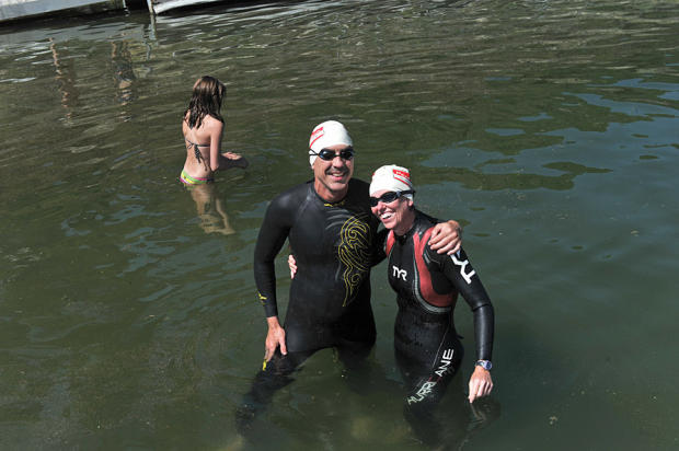 Happy couple before a practice swim in milder than usual waters.