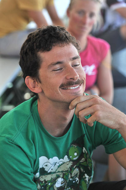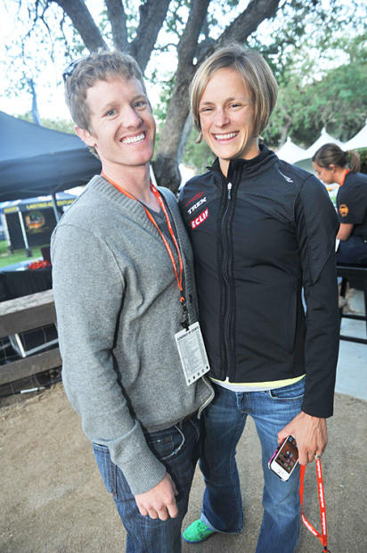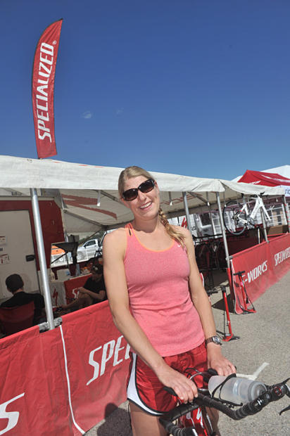 Defending champion Jesse Thomas confers with Specialized technician.