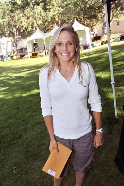 Heather Gollnick, 2003 Wildflower champion, poses by her Stairway of Champions plaque.