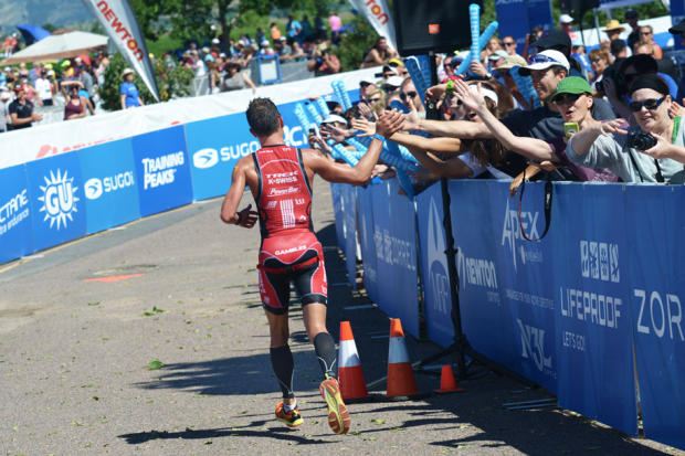 Joe Gambles high fives the crowd in the finish chute on his way to a 3rd straight Boulder 70.3 victory.