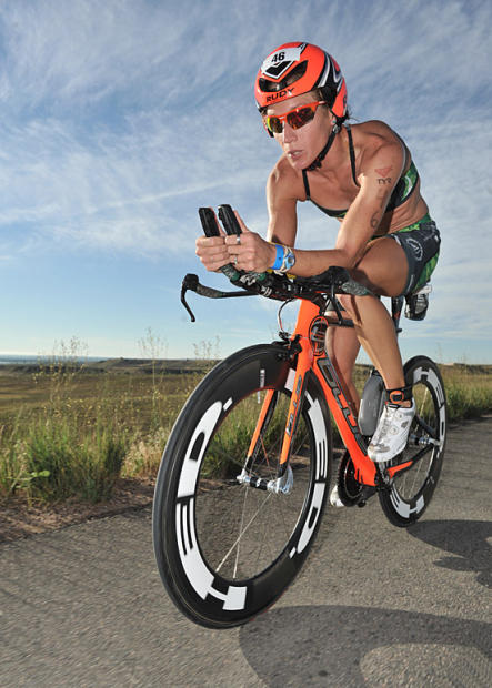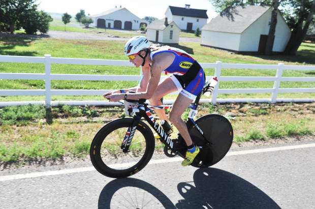 Leanda Cave rides on her way to the 4th best women’s bike split of 2:20:35.