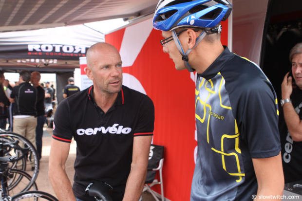 Former Pro Kai Hundertmarck hard at work in the Cervelo booth.