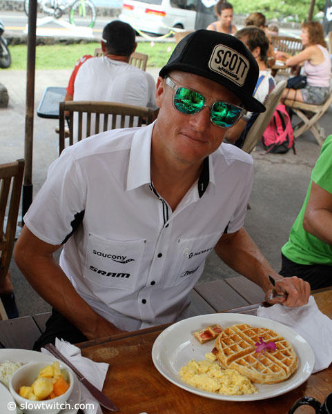 The fast Aussie enjoyed a waffle and egg breakfast and had already finished the bacon that came with that plate.
