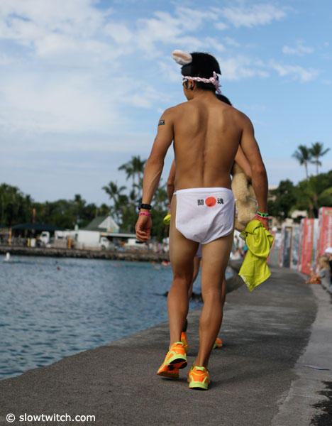 A couple Japanese underpants run participants are either heading back to the hotel or a dip at the pier.