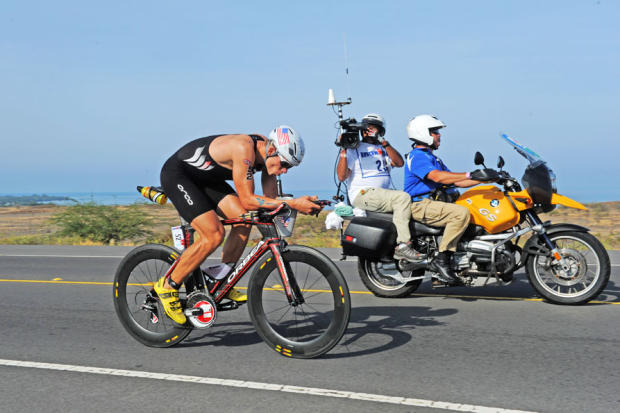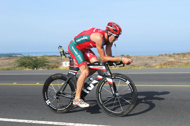 Frederik Van Lierde, a fast Belgian wearing unique bike headgear that looks like an old football helmet without a face guard, rode a 4th-best 4:25:35 split on his way to victory.