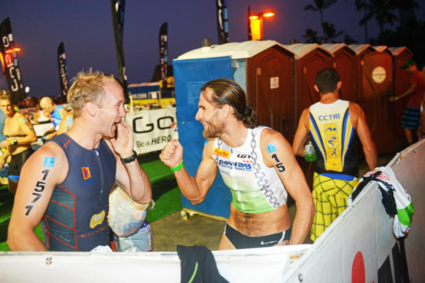 Faris Al-Sultan shares a pre-race laugh with age grouper Sascha Holsten.