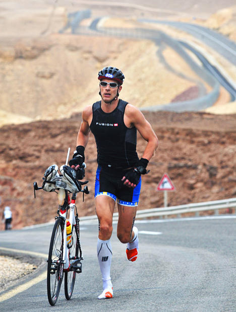 Anders Stampe runs a mile to T2 with a broken chain. The 31-year-old Danish triathlete finished just 5:57 back of the Half Israman winner Lior Zach Maor.